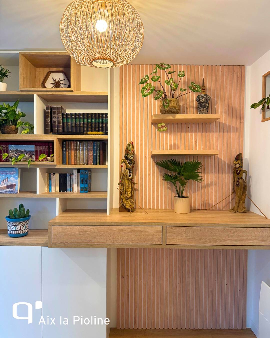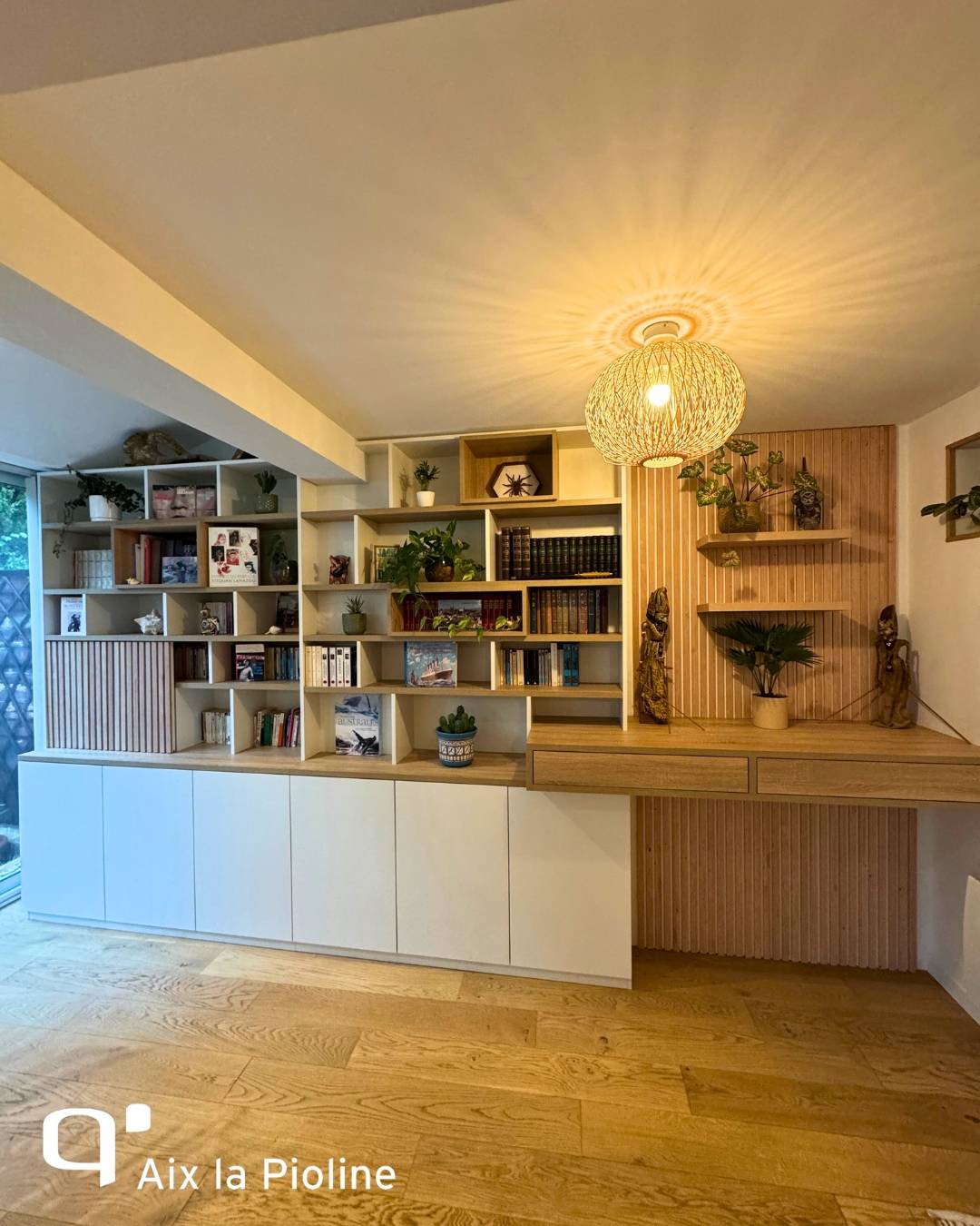 Chez Quadro Aix La Pioline, nous avons imaginé un meuble sur mesure qui combine rangements fermés, niches ouvertes et un petit bureau intégré, pour transformer un mur en un espace à la fois pratique et esthétique. Chaque élément a été pensé pour optimiser l’espace tout en apportant une harmonie visuelle à la pièce.