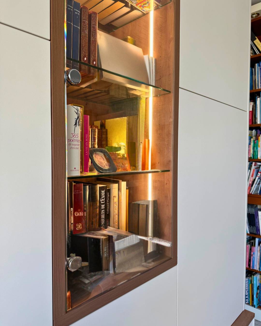 ? Au cœur de cet agencement, une vitrine centrale rétroéclairée attire le regard et donne le ton. Elle met en lumière les objets précieux, les ouvrages favoris ou les souvenirs choisis de nos clients, transformant ainsi le meuble en véritable vitrine d’expression personnelle. L’éclairage LED intégré crée une ambiance douce et chaleureuse, parfaite pour habiller un mur sans l’alourdir visuellement.