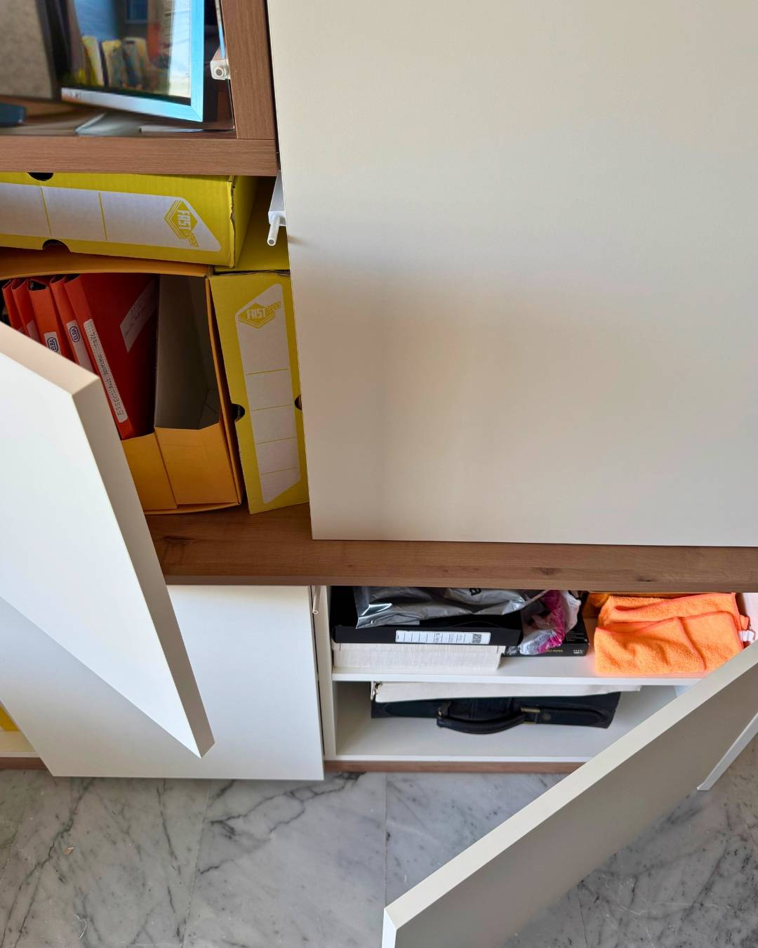 ?️ Les portes battantes, habillées de façades sobres et élégantes, dissimulent des rangements généreux en profondeur. Ces espaces permettent d’organiser facilement dossiers, accessoires, textiles ou tout autre élément du quotidien, avec une grande fluidité d’usage.