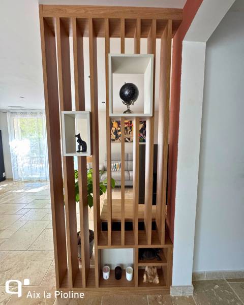 Dans ce projet, nous avons conçu une cloison décorative sous forme de claustra vertical, afin de séparer subtilement deux espaces de vie — le salon et l’entrée — tout en préservant l’ouverture visuelle et l’harmonie de l’ensemble.
