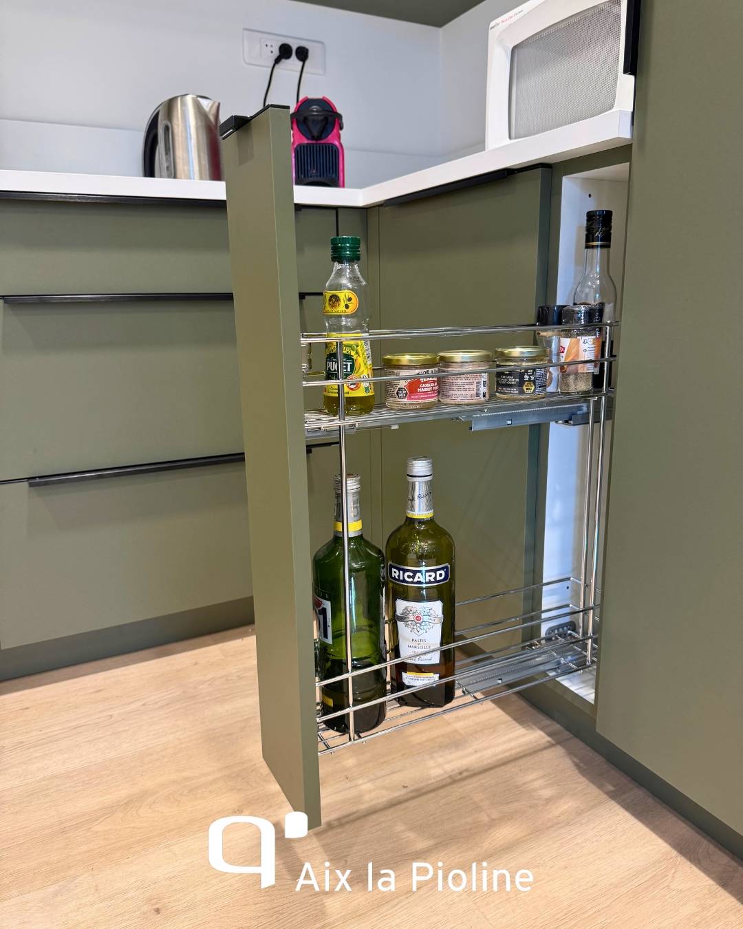 Grâce à des rangements astucieux, tout est à portée de main : placards ergonomiques, tiroirs bien agencés et niches ouvertes apportant une touche dynamique à l’ensemble. Le choix d’un vert olive apporte une esthétique moderne et apaisante, sublimée par des lignes épurées qui confèrent à la pièce un charme intemporel.