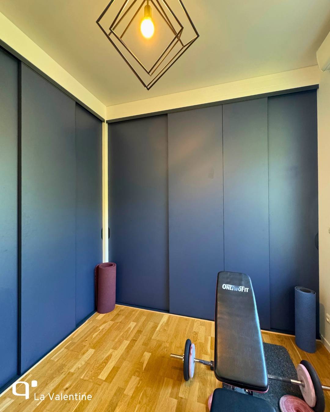 Cette teinte profonde apporte du caractère tout en créant une atmosphère apaisante et élégante, idéale pour un coin sport ou un moment de détente. Le choix du bleu indigo n’est pas anodin : il évoque la sérénité, la confiance et favorise la concentration, des qualités parfaites pour un espace où l’on prend soin de soi.