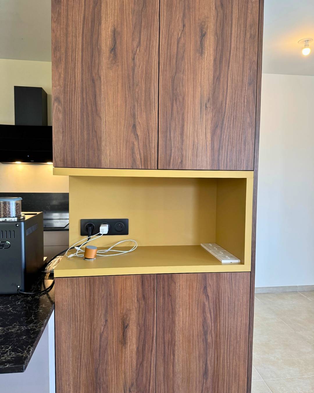 L’espace ouvert aux tons moutarde apporte quant à lui une touche d’audace et de personnalité. Cette note colorée dynamise l’ensemble et crée un contraste subtil avec les façades effet noyer, dont la texture naturelle vient réchauffer l’ambiance.
