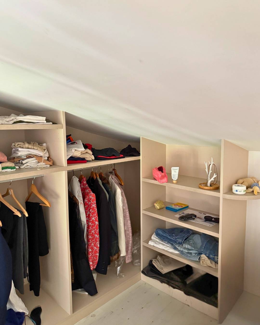 Grâce à une conception 100 % personnalisée, notre équipe a su transformer cette contrainte en un atout esthétique et fonctionnel. Le dressing épouse parfaitement la pente du toit, exploitant chaque centimètre de hauteur disponible.