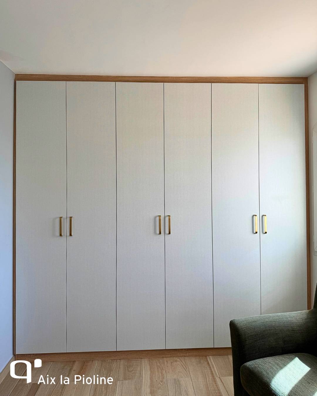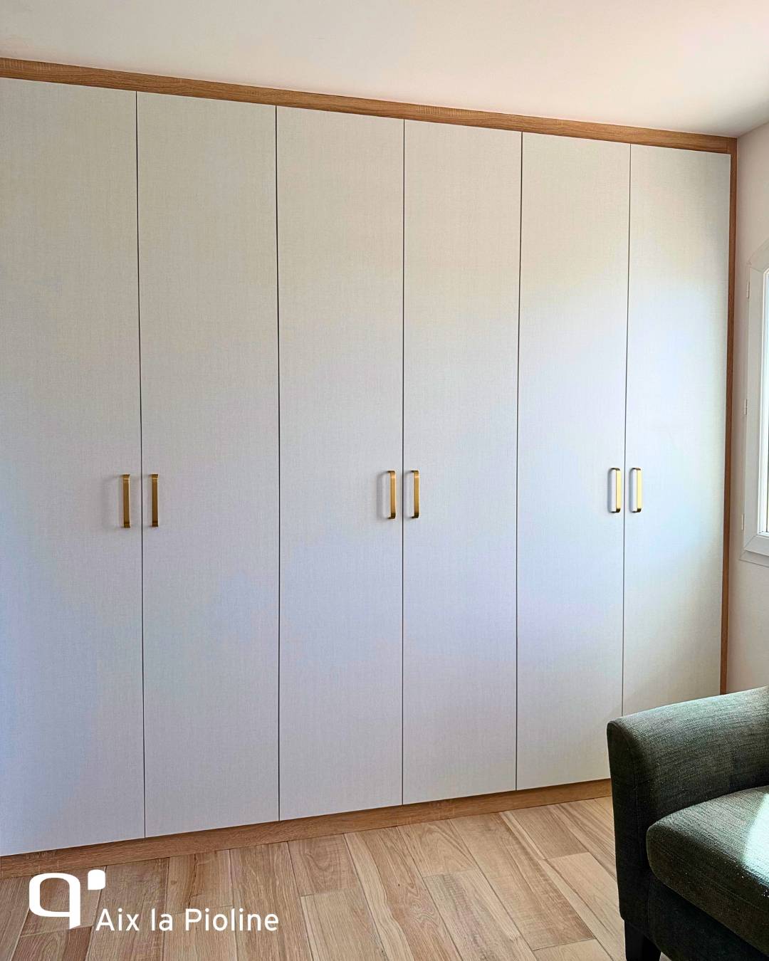 La façade en finition tissu clair, subtilement soulignée par un encadrement bois chaleureux et des poignées dorées au design contemporain, s’intègre parfaitement avec le parquet, créant un effet chic, naturel et cohérent avec le reste de la pièce.