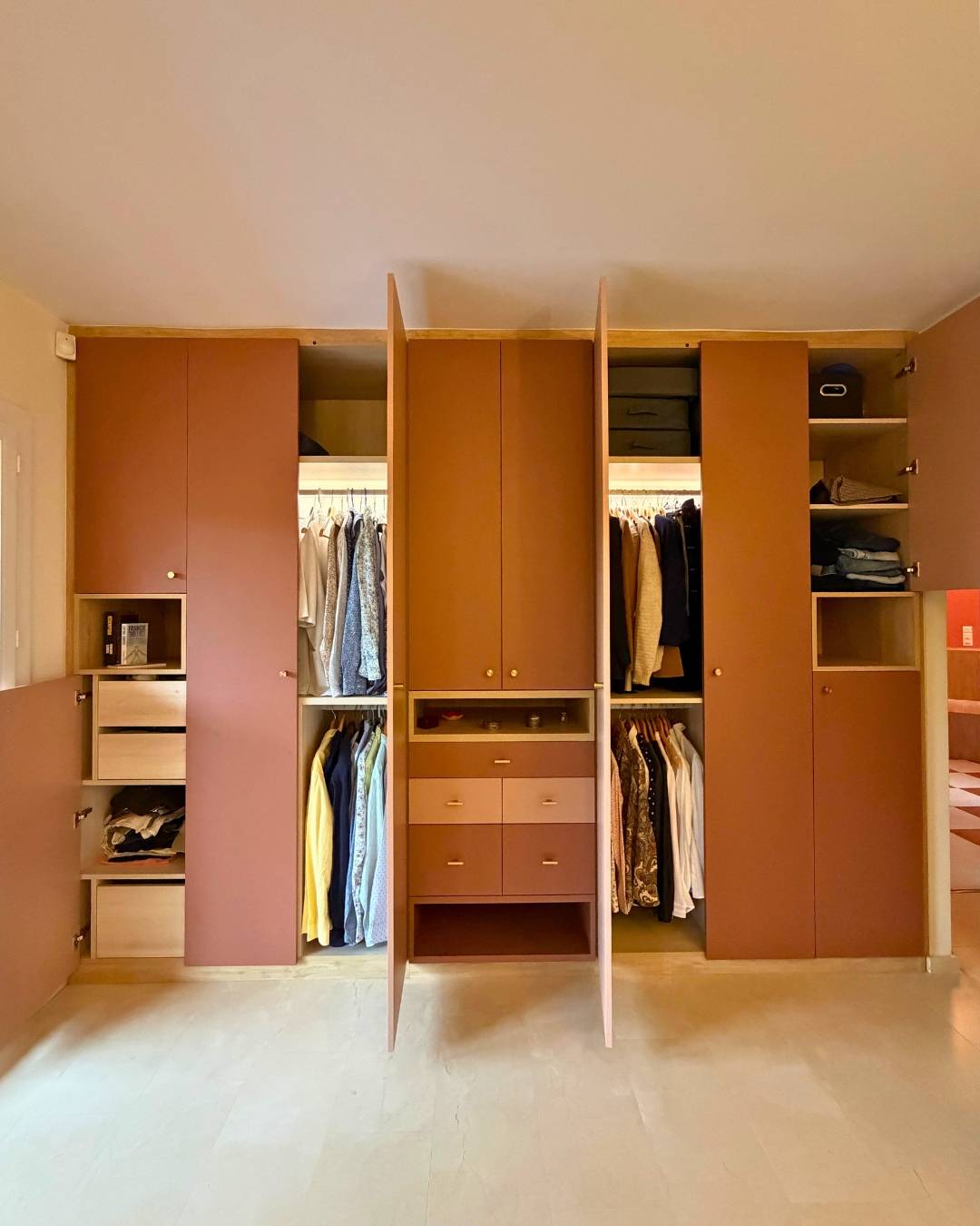 Ce dressing sur mesure signé QUADRO Aix La Pioline allie avec justesse douceur, élégance et personnalité. Imaginé pour une chambre à l’atmosphère apaisante, il marie subtilement les tons terracotta et nude abricot, une palette chaleureuse et lumineuse qui apporte de la profondeur tout en conservant une grande légèreté visuelle.