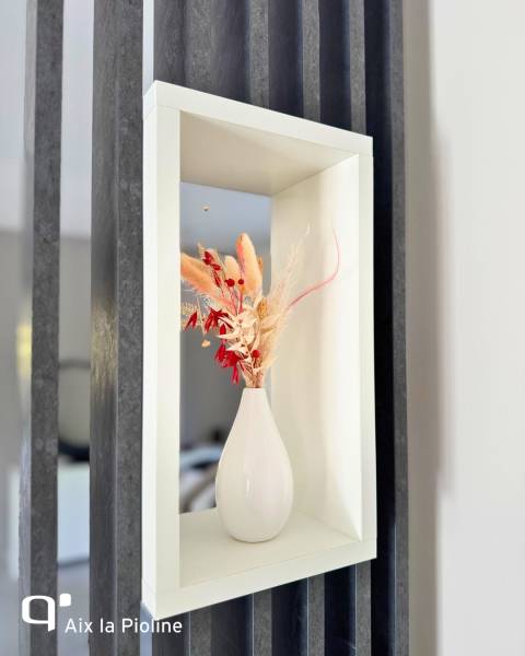 Les détails soignés apportent toute la personnalité de cette réalisation : des niches décoratives subtilement intégrées, l’association du blanc lumineux et des lames verticales foncées pour un contraste moderne, et une composition équilibrée entre design et praticité.