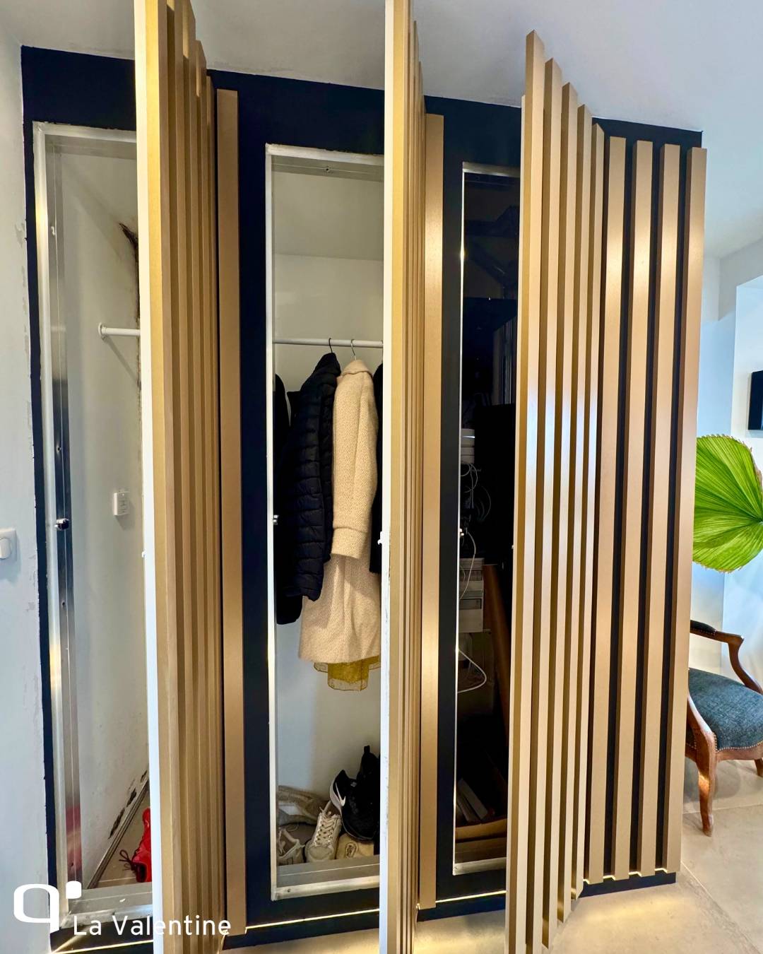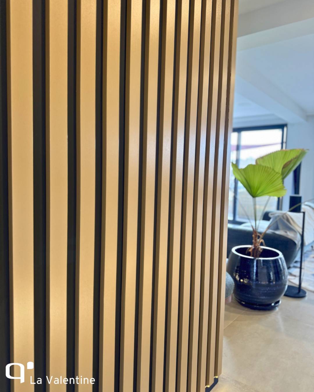 Pensé pour dissimuler astucieusement une entrée, il intègre des portes discrètes et fonctionnelles qui se fondent parfaitement dans l’ensemble. L’effet caché est bluffant : l’entrée devient presque invisible, renforçant le côté épuré et moderne de l’aménagement à Allauch.