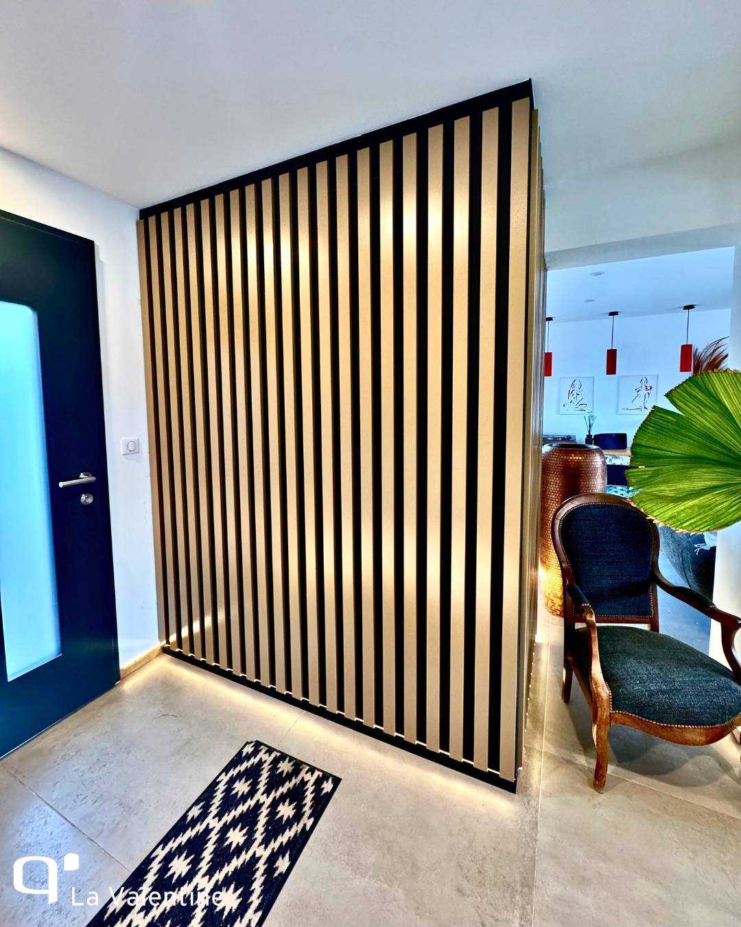 Alliant esthétisme et ingéniosité, ce claustra sur mesure transforme l’entrée en un véritable atout déco. Il permet de structurer l’espace tout en préservant une circulation fluide et une ambiance aérée. Son design graphique joue avec la lumière et les ombres, créant un effet visuel unique qui évolue au fil de la journée.