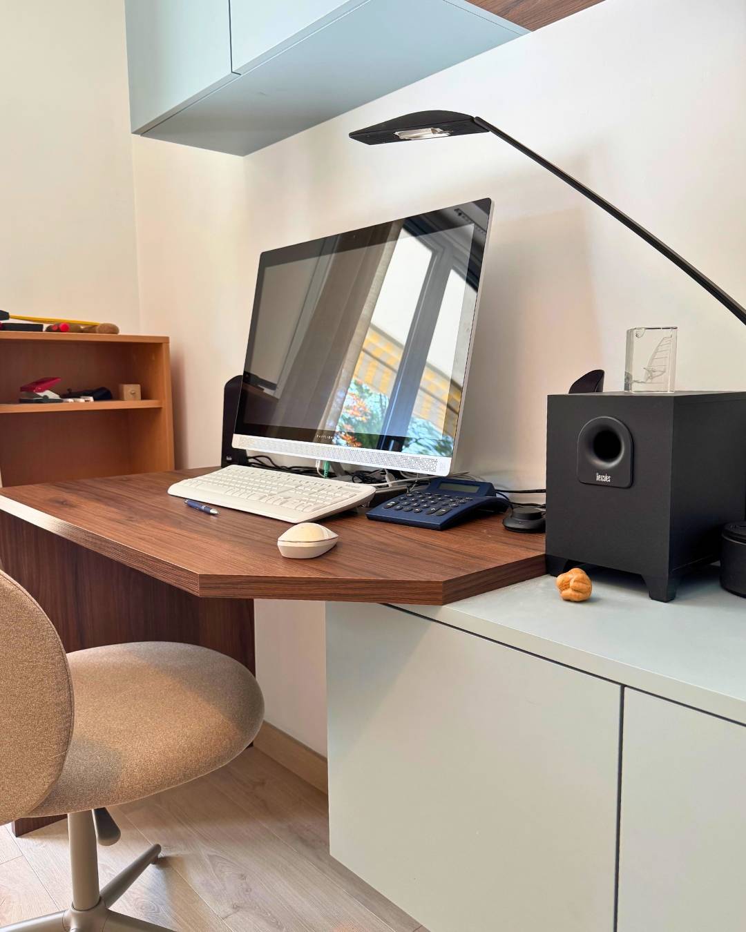 Dans ce projet, notre objectif était de créer un coin bureau à la fois pratique, raffiné et parfaitement intégré à la chambre. L’idée était d’aménager un espace dédié au travail sans alourdir la pièce ni rompre son harmonie. Nous avons ainsi imaginé un ensemble en noyer et bleu-gris, alliant chaleur du bois et modernité des finitions mates.