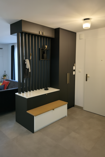 Le meuble d’entrée avec claustra de Mme P. devait initialement être assez simple et consensuel à Marseille La Valentine 13011.