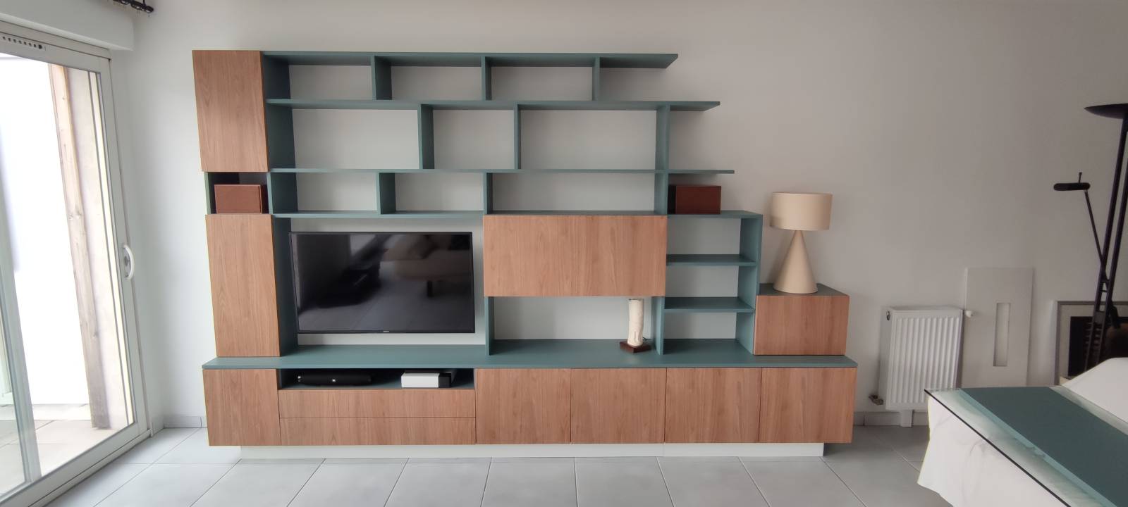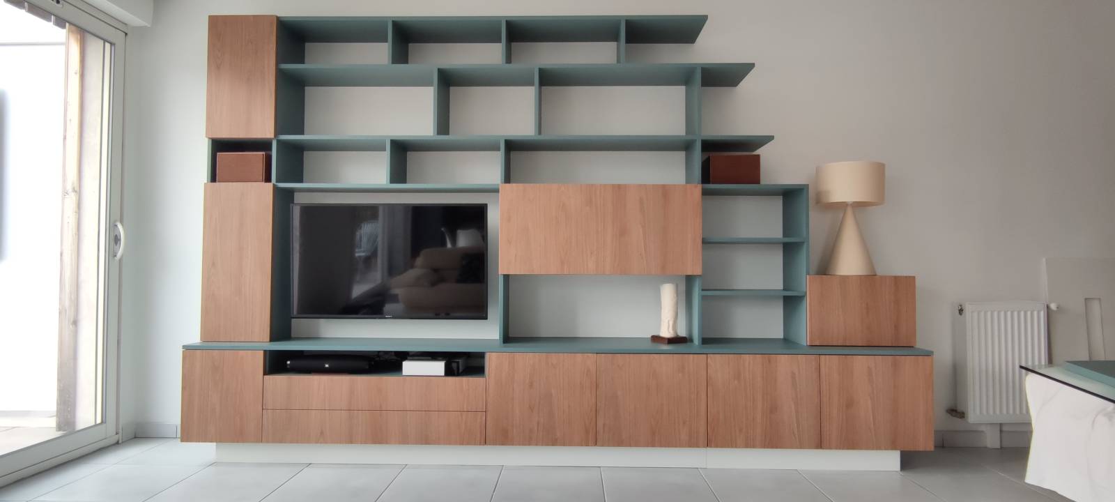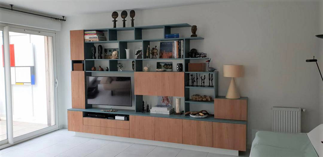 M. Z avait bien étudié son projet et avait tout mis sur plan. Restait juste à déterminer les finitions à appliquer. Le choix s'est porté sur le "gris granit" et le "noyer doré". Les plinthes couleur du sol, le détail qui permet de donner un coté suspendu à cet ensemble bibliothèque et meuble TV.