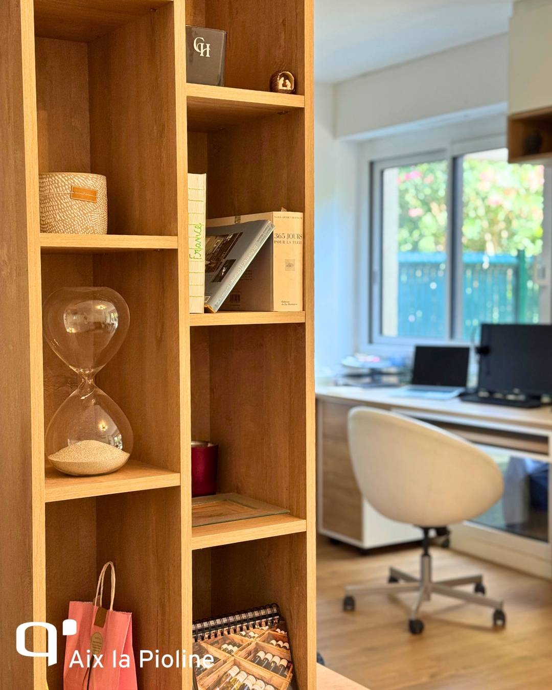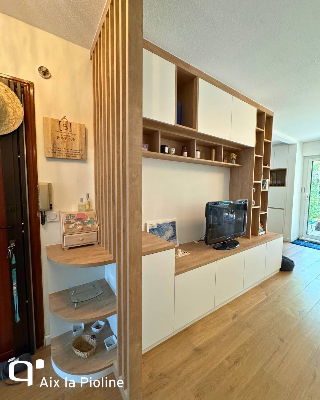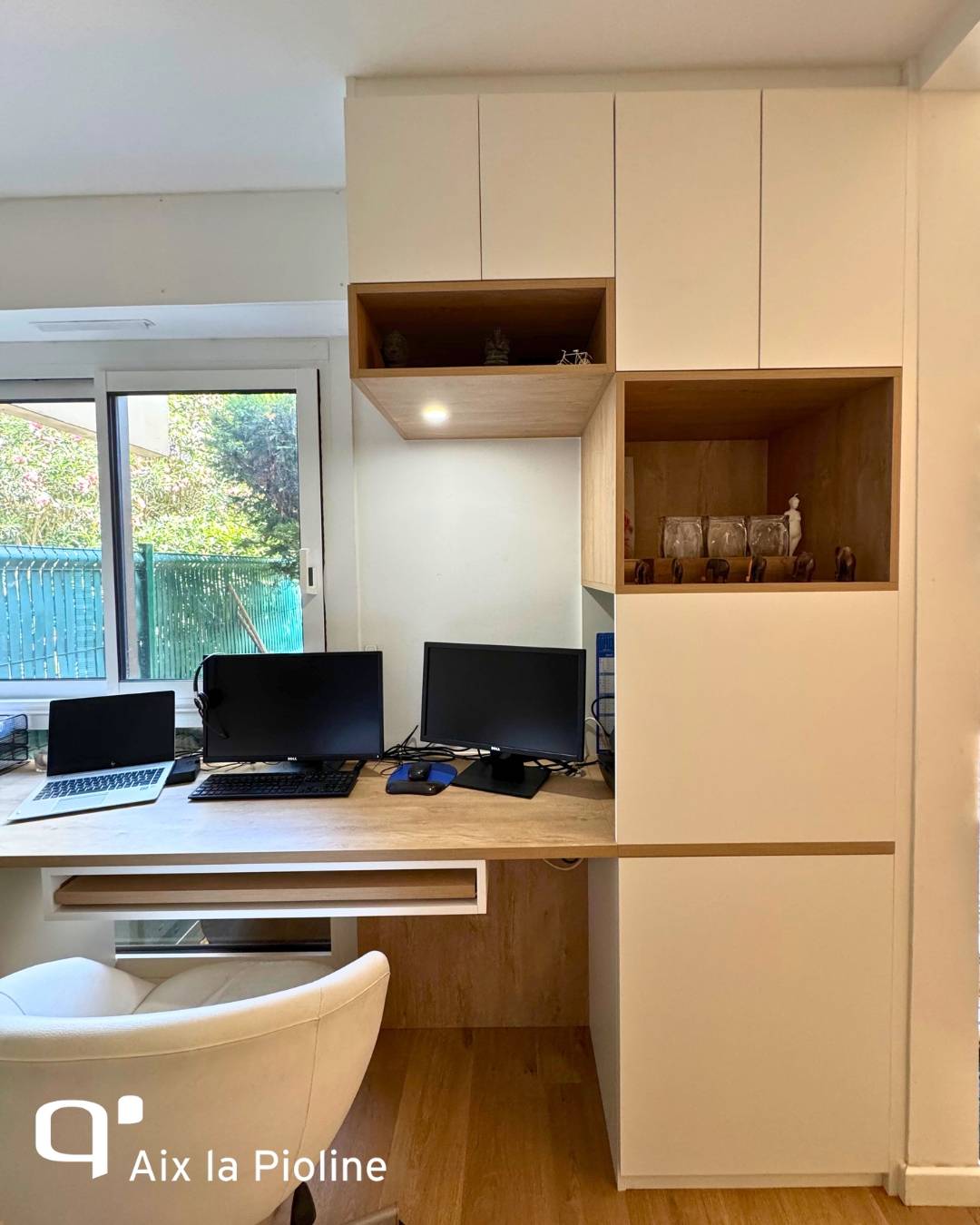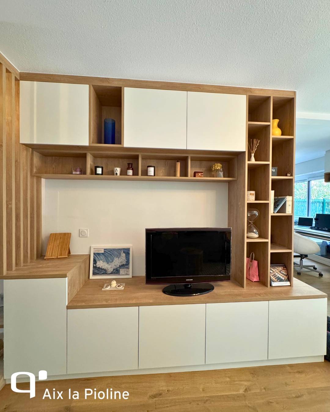 Chez Quadro Aix La Pioline, nous avons conçu un meuble TV sur mesure qui se prolonge naturellement en un coin home office fonctionnel, optimisant l’espace sans jamais sacrifier le style.