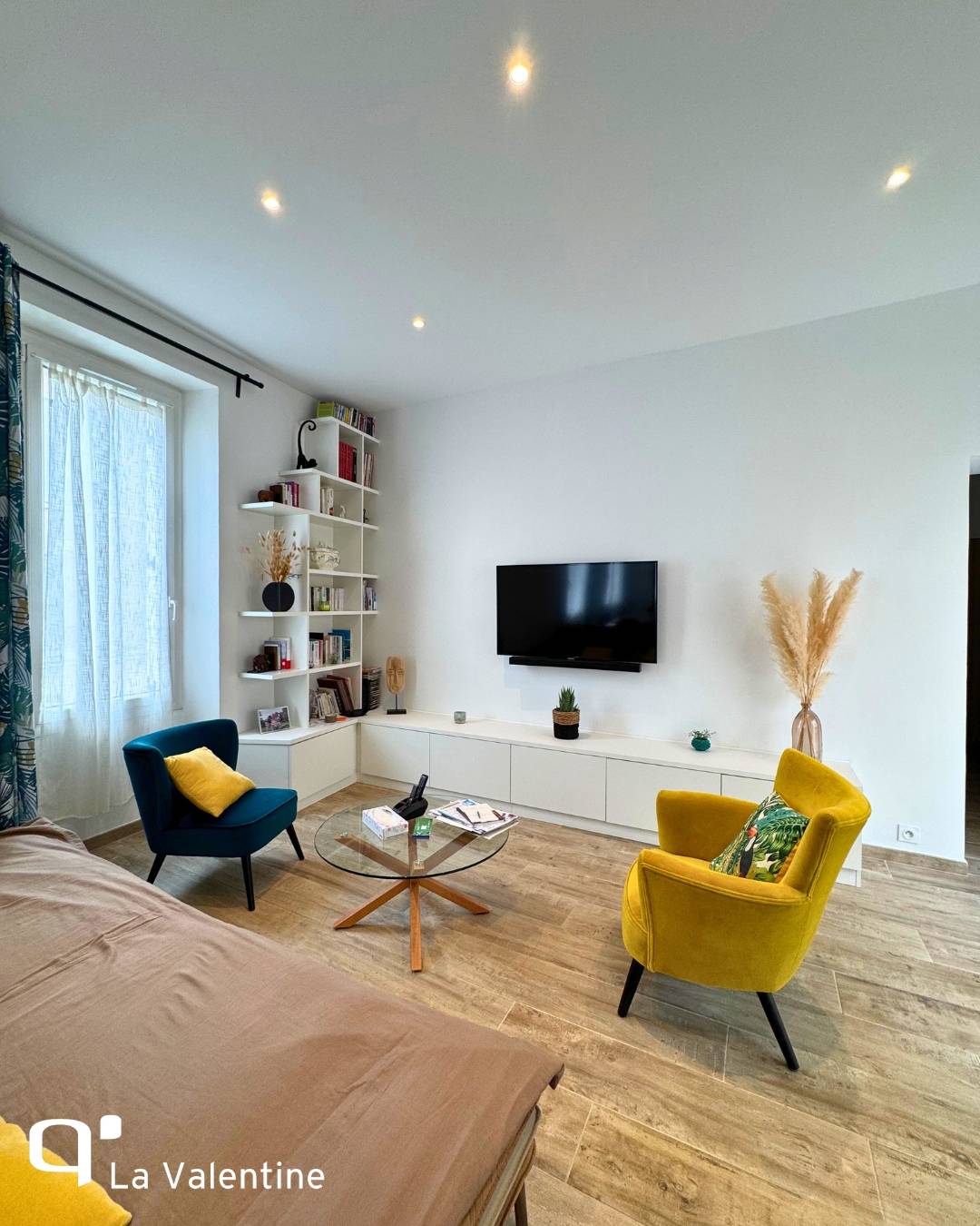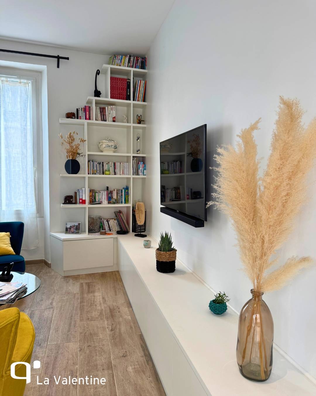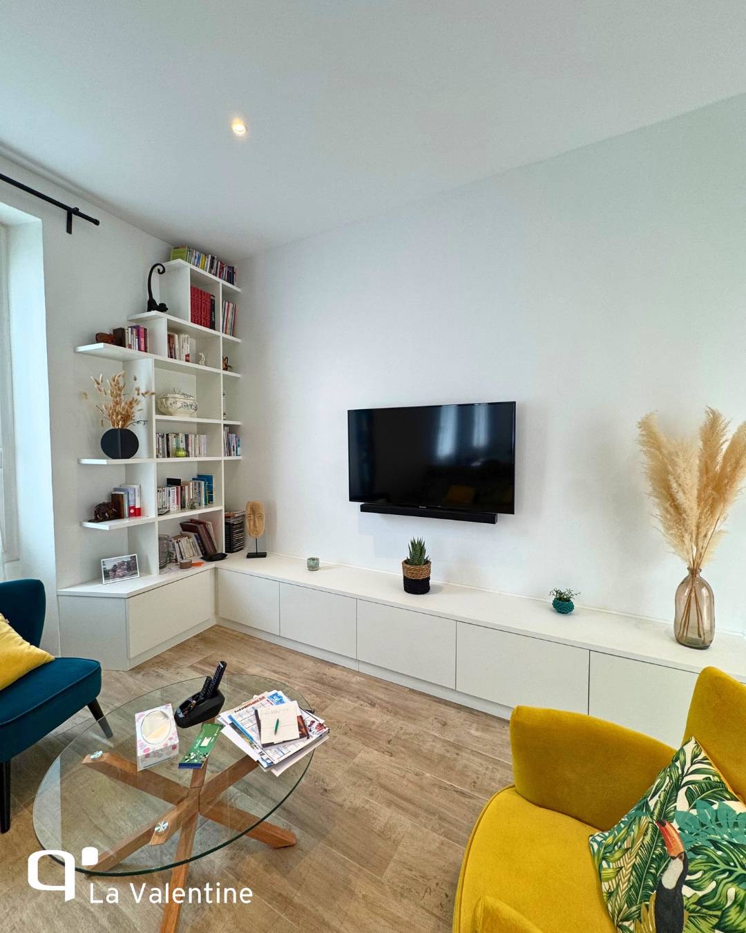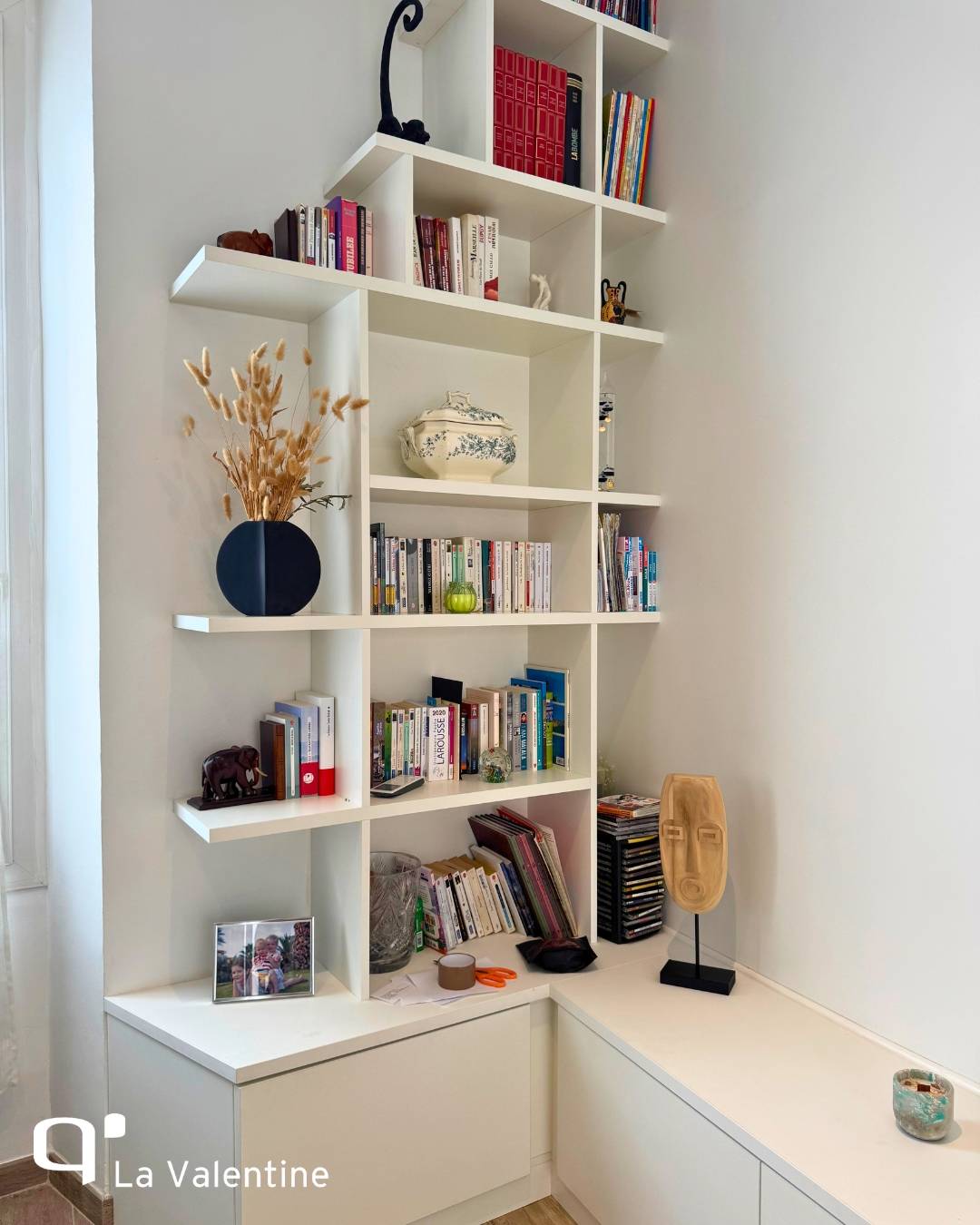 Cet aménagement sur mesure illustre parfaitement la philosophie de Quadro La Valentine : créer des espaces à la fois esthétiques et pratiques, pensés pour s’intégrer harmonieusement dans le quotidien. Ici, le coin salon a été repensé autour d’un meuble TV discret et épuré, accompagné d’une bibliothèque sur mesure qui vient structurer l’ensemble sans jamais l’alourdir.