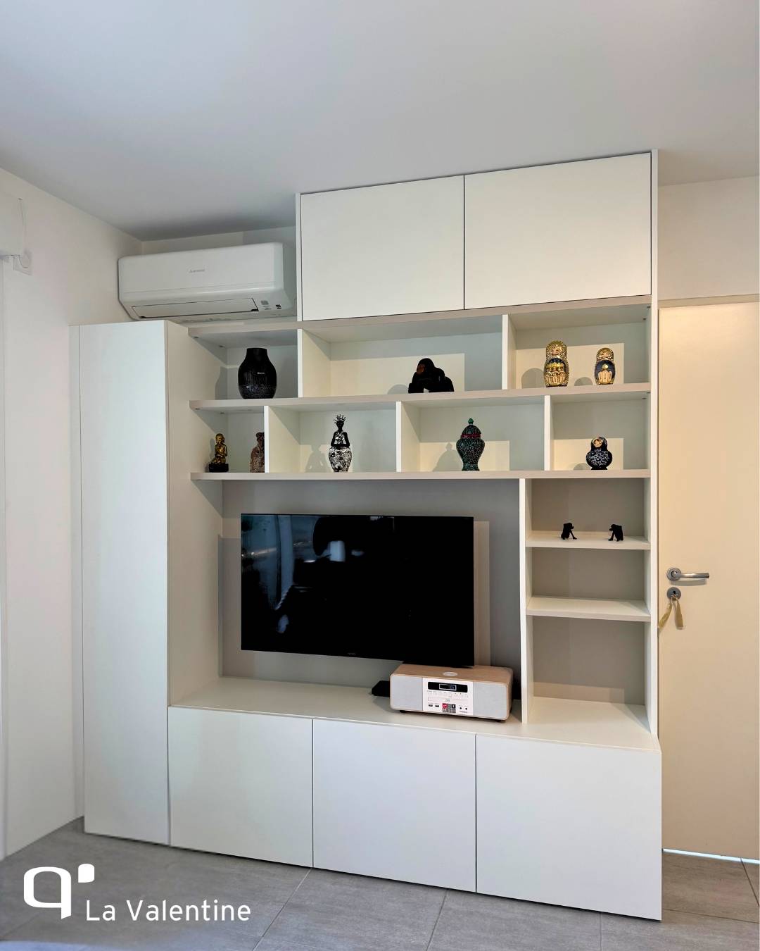 Chaque détail a été soigneusement étudié : les rangements bas fermés permettent de dissimuler les équipements multimédias et autres objets du quotidien, tandis que les niches ouvertes accueillent livres, plantes ou éléments décoratifs, créant un jeu de volumes équilibré et dynamique. L’aménagement supérieur exploite la hauteur du mur pour maximiser l’espace disponible, tout en préservant la légèreté visuelle de l’ensemble à Marseille 12ème.