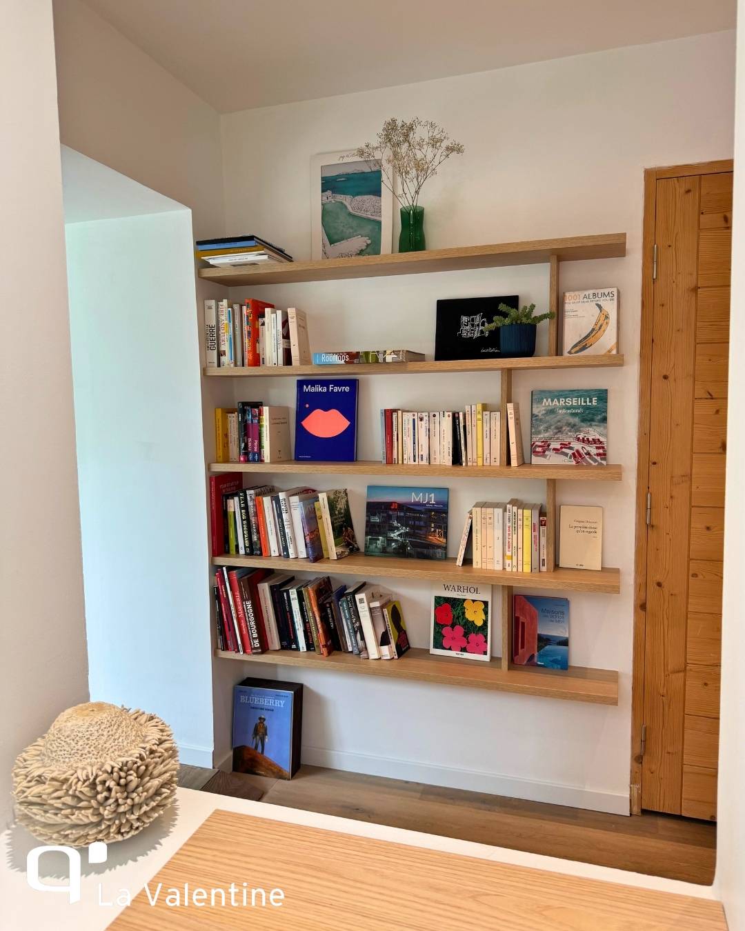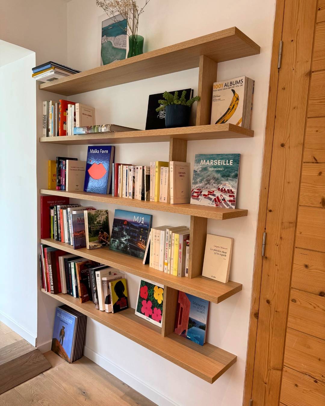 Cette bibliothèque ouverte, imaginée et réalisée sur mesure par Quadro La Valentine, s’intègre parfaitement dans une niche murale, pour un résultat à la fois discret, fonctionnel et visuellement harmonieux.