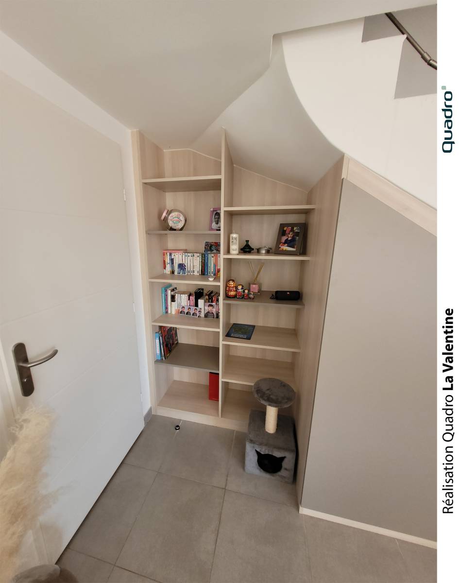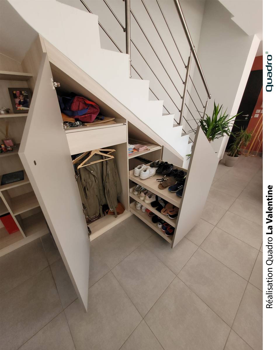 Un beau projet d’aménagement sous escalier, comme on les affectionne particulièrement chez Quadro La Valentine, allie esthétisme, ingéniosité et fonctionnalité. Les espaces en pente représentent souvent un véritable défi d’agencement : leur géométrie atypique et leurs volumes restreints rendent difficile l’intégration de meubles standards. C’est pourquoi le sur-mesure s’impose comme la meilleure solution pour exploiter chaque recoin et transformer un espace perdu en zone de rangement élégante et utile.