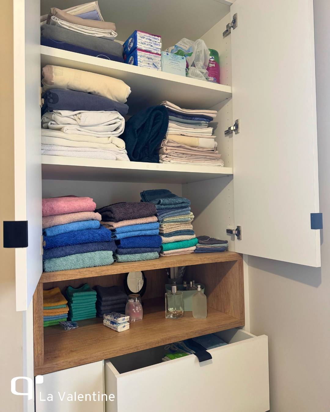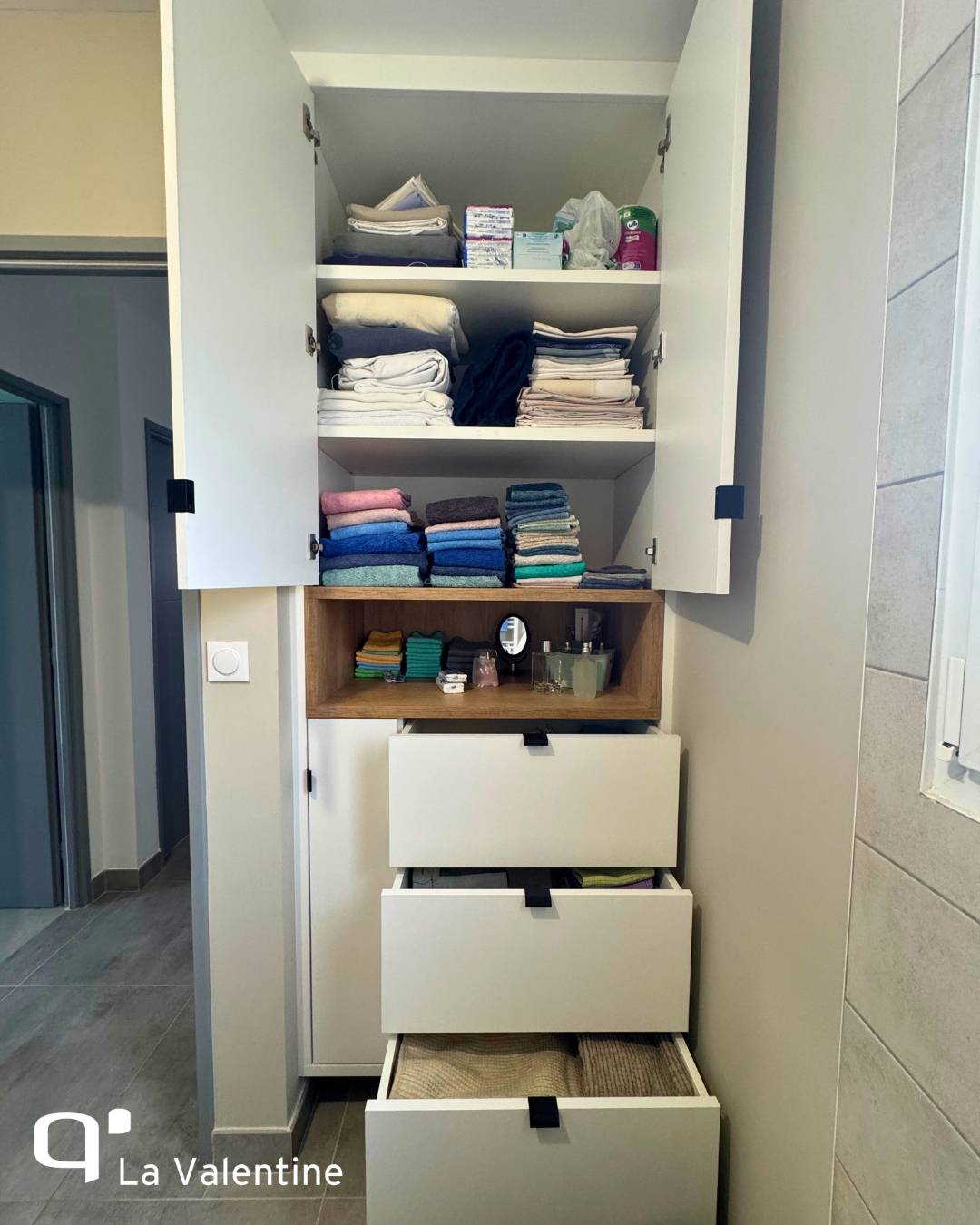 Ici, ce meuble toute hauteur a été spécialement imaginé pour exploiter la profondeur du mur et transformer un espace contraint en véritable atout. Grâce à ses grandes étagères, les serviettes trouvent enfin leur place, parfaitement pliées et toujours accessibles. Les tiroirs spacieux accueillent facilement le linge de bain, les produits de soin ou les accessoires du quotidien, permettant de garder la pièce impeccable. La niche déco, quant à elle, offre un espace à la fois pratique et esthétique : on y dépose les essentiels que l’on aime avoir sous la main, tout en apportant une touche de personnalité à la salle de bain.