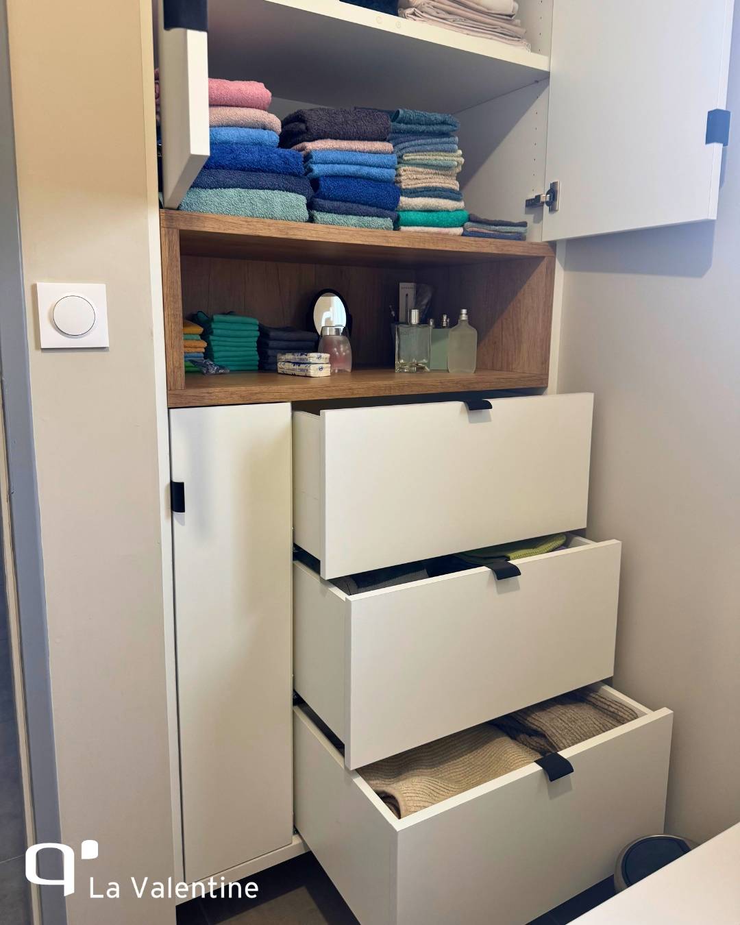 Et pour ceux qui souhaitent dissimuler le petit bazar du quotidien, ce meuble offre aussi des solutions discrètes, idéales pour cacher tout ce qui ne doit pas traîner. Résultat : une salle de bain ordonnée, fonctionnelle et agréable à vivre, où chaque détail a été pensé pour allier confort et design à Marseille.