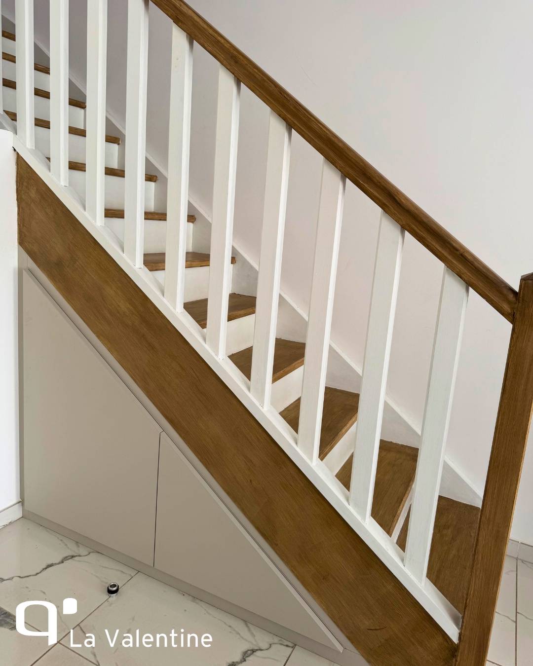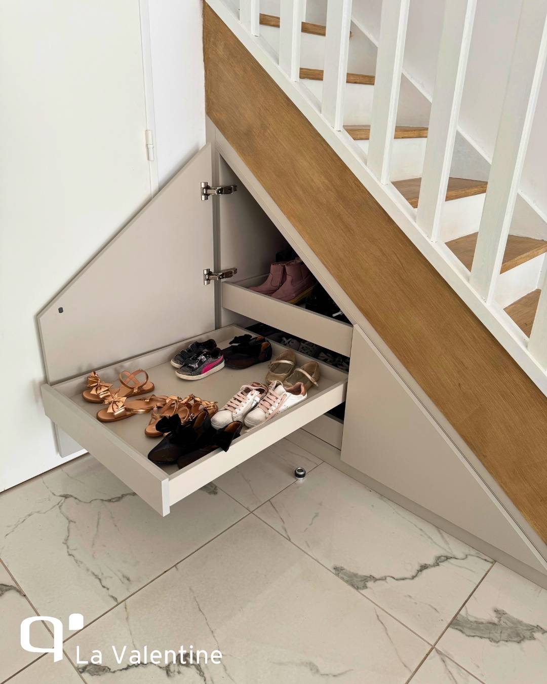 Sous cet escalier, un meuble multifonctions exploite chaque centimètre disponible pour allier élégance et optimisation de l’espace. Des niches ouvertes permettent d’exposer livres, objets déco ou souvenirs, apportant une touche chaleureuse et personnalisée à la pièce. Le grand plan de rangement bas est idéal pour cacher ce qui ne doit pas traîner, tout en gardant l’espace ordonné et agréable à vivre. Les finitions bois et blanc ajoutent une note contemporaine et réchauffent visuellement l’ensemble.