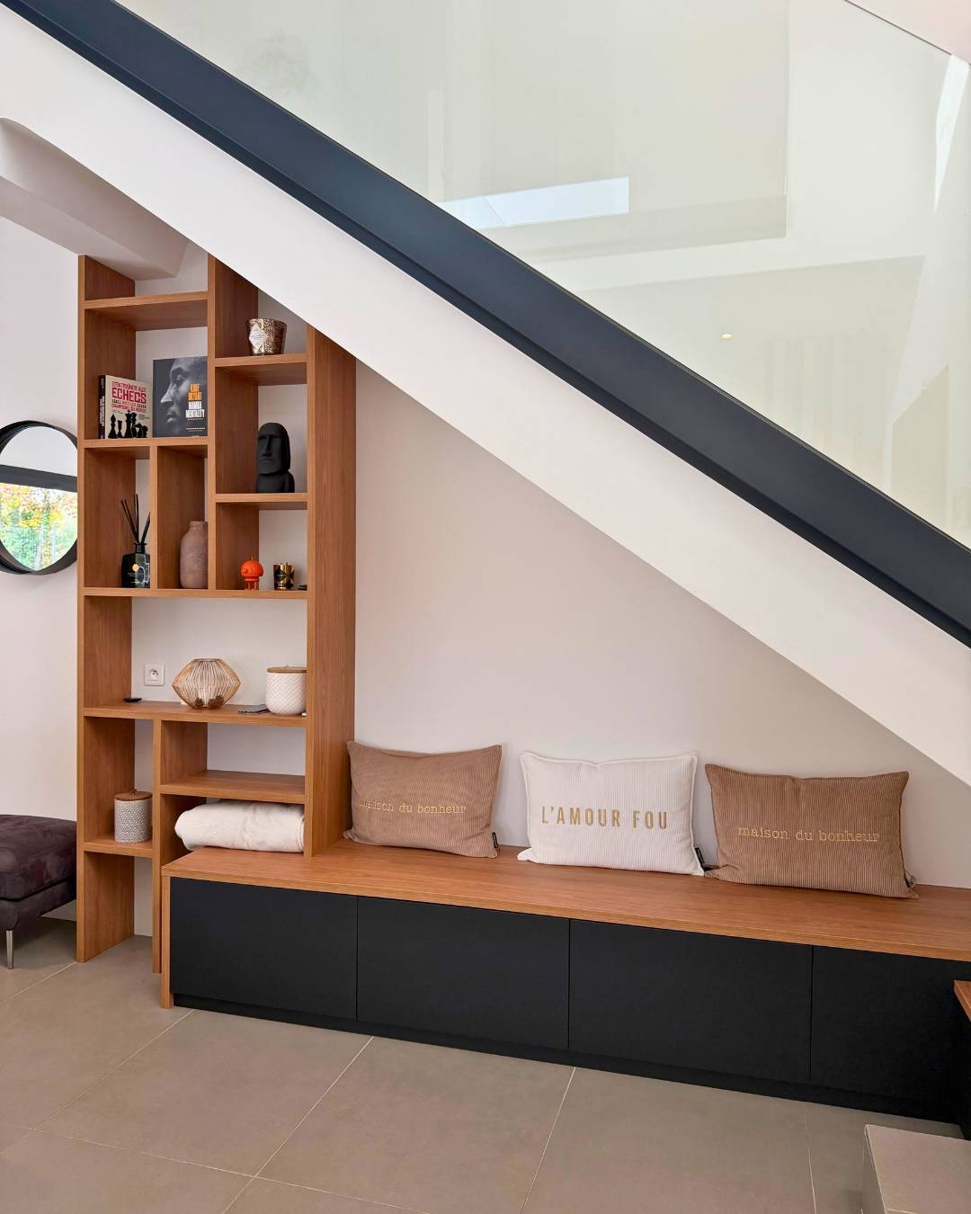 Cette création sur mesure signée QUADRO Aix La Pioline illustre parfaitement la philosophie du sur-mesure : optimiser sans alourdir, sublimer sans encombrer. L’espace sous l’escalier, souvent difficile à exploiter, devient ici un véritable atout décoratif et fonctionnel.