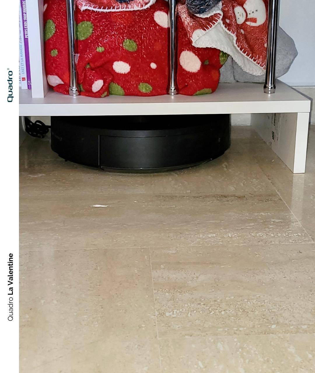Une niche discrète a également été intégrée pour abriter un robot aspirateur, lui permettant de se ranger et se recharger automatiquement, sans gêner la circulation dans la pièce. Ce souci du détail illustre parfaitement la philosophie Quadro : créer des aménagements aussi beaux qu’intelligents.