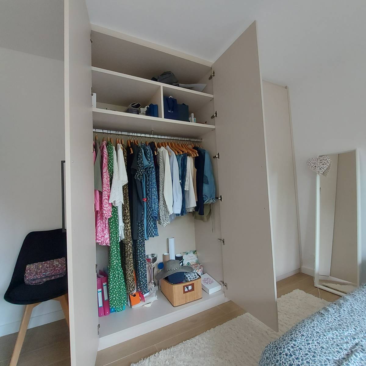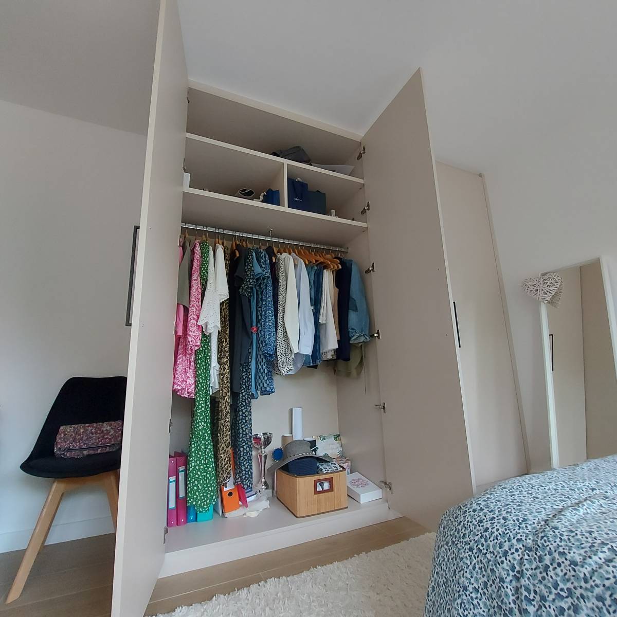 En effet, après avoir repensé la décoration des murs et du mobilier, les parents sont venus à notre rencontre pour réaliser un dressing sur-mesure ; les solutions du commerce auraient pu convenir dans l'ensemble, mais ici, il y avait une réelle volonté de créer et de penser ensemble un dressing à la fois fonctionnel et cohérent avec la décoration d'intérieur.
