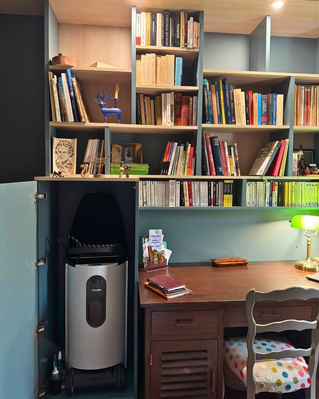 Le bureau, en bois sombre, s’accorde parfaitement avec les nuances bleutées des rangements. Il combine élégance et fonctionnalité pour offrir un espace de travail à la fois épuré et inspirant.