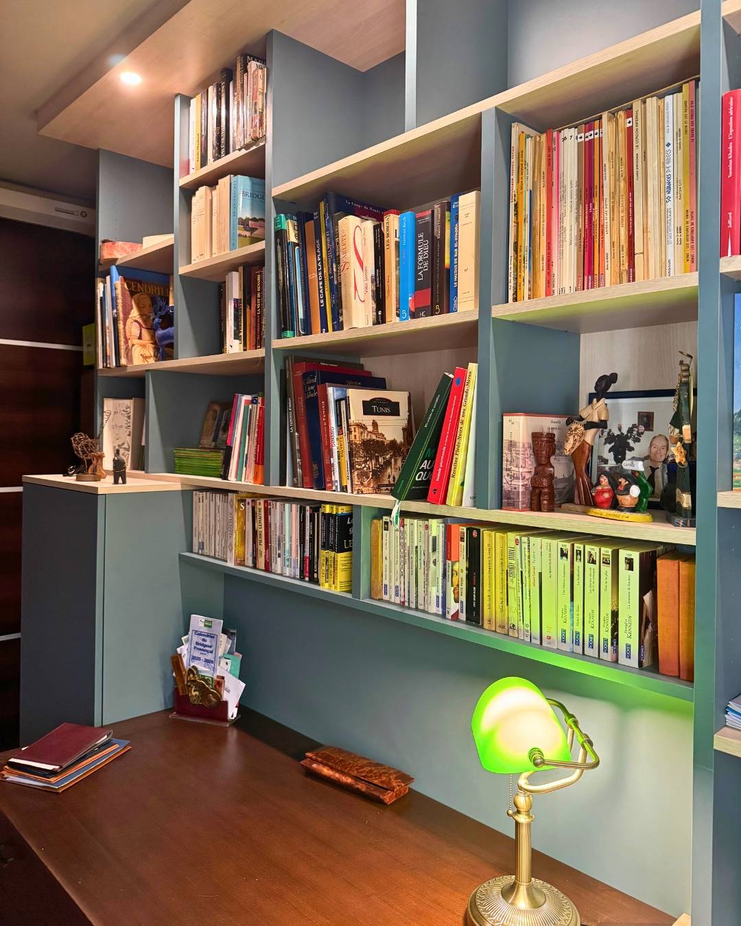La bibliothèque sur mesure se distingue par ses niches asymétriques et ses teintes subtiles, qui apportent du relief et du caractère à la pièce. Elle devient un véritable élément de décoration, tout en offrant une capacité de rangement généreuse et bien structurée. L’éclairage intégré vient souligner les lignes du meuble, mettant en valeur les livres, objets et souvenirs, tout en créant une atmosphère apaisante, idéale pour la lecture ou la concentration à Marseille 13012.
