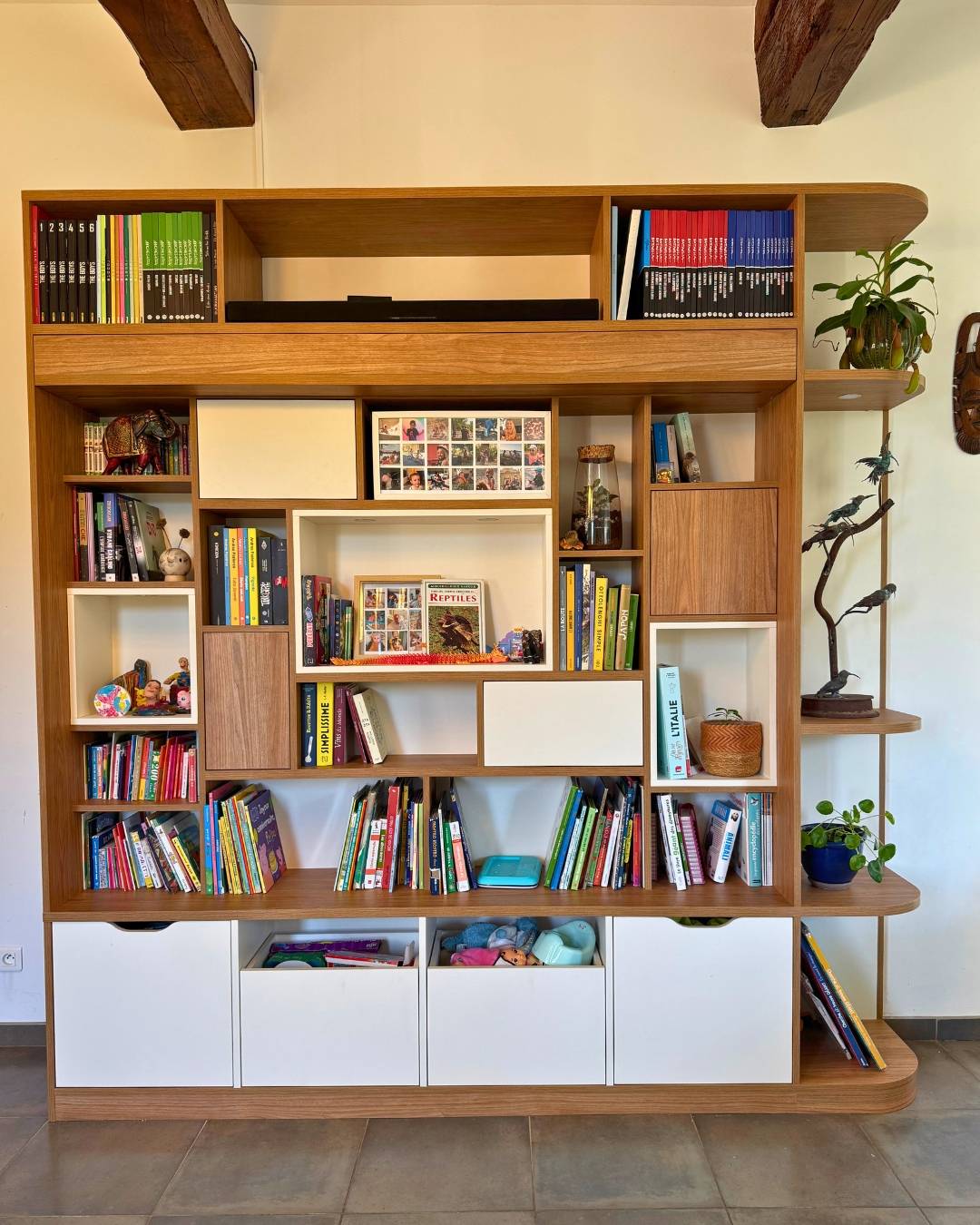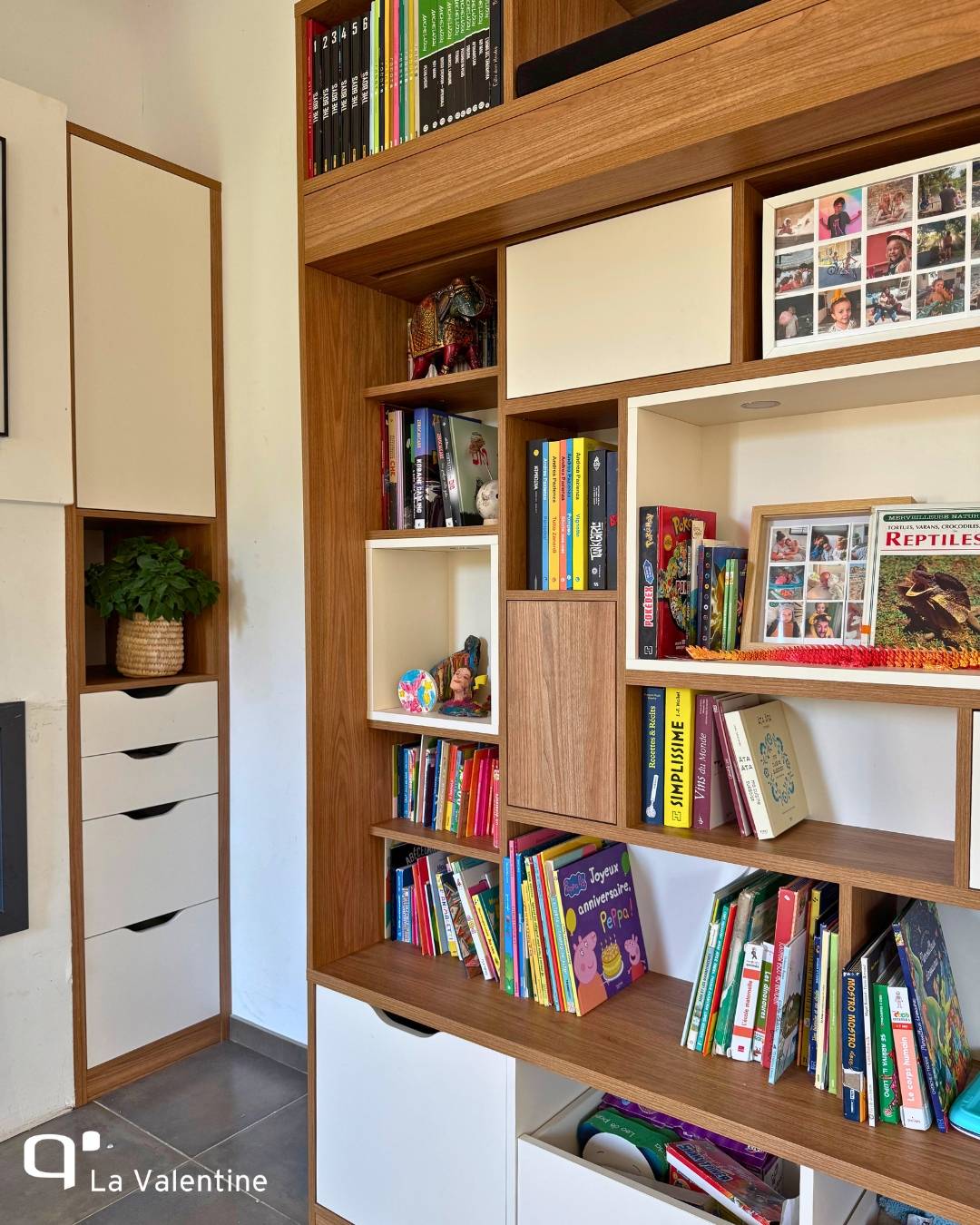 Dans cette réalisation signée Quadro La Valentine, la bibliothèque devient bien plus qu’un simple meuble : c’est un véritable élément de vie, pensé pour s’adapter aux besoins et aux habitudes de toute la famille. Alliant design, modularité et praticité, elle offre une solution élégante pour organiser le quotidien avec style à Marseille 13010.