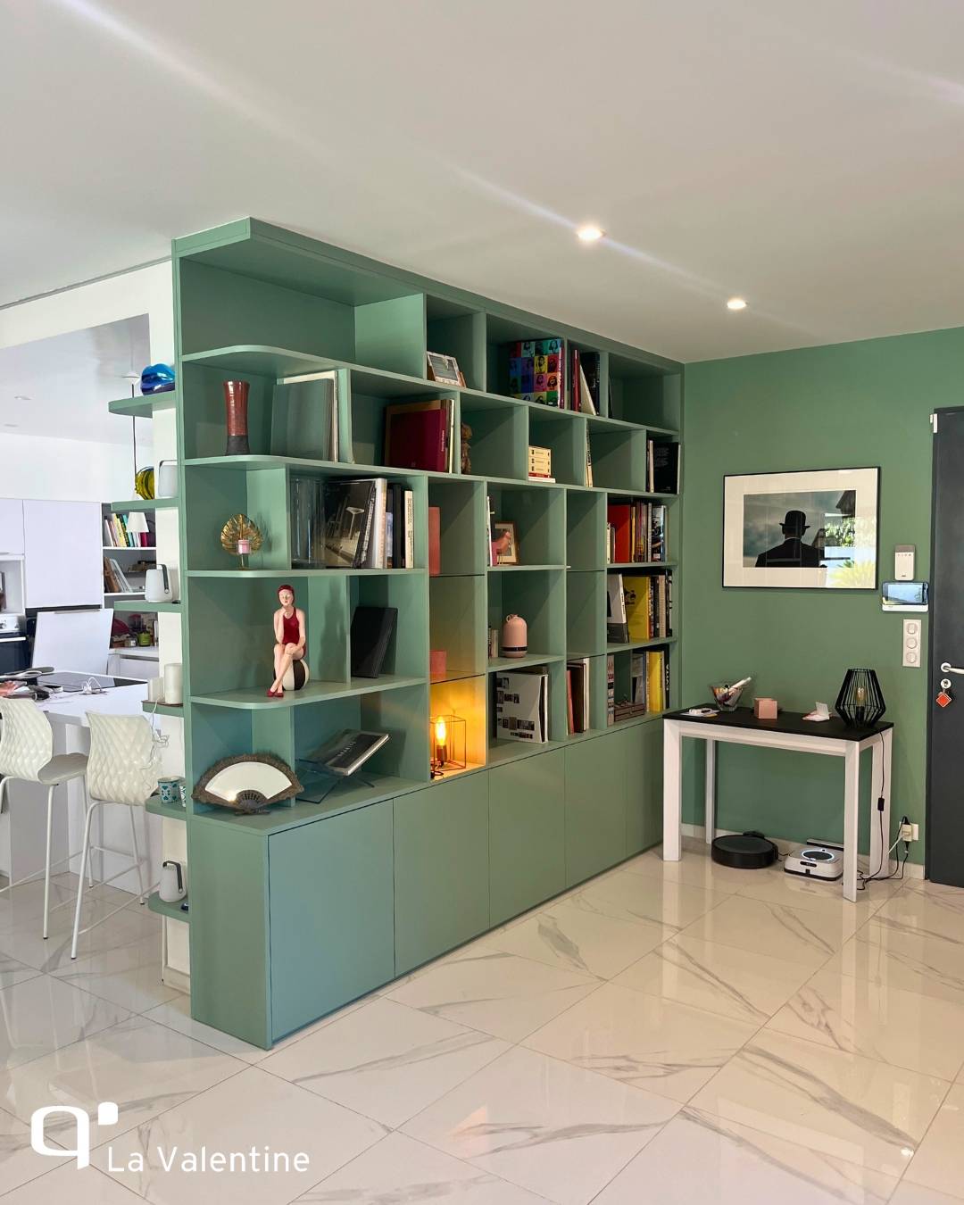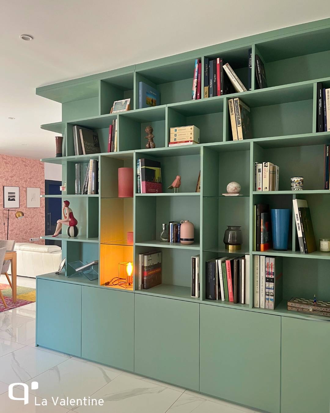 Cette bibliothèque sur-mesure apporte une véritable identité à la pièce et devient un élément central de la décoration. Conçue dans un ton vert doux, à la fois original et apaisant, elle habille le mur avec élégance tout en structurant l’espace de manière fluide et harmonieuse. Son design unique permet de marier subtilement esthétique et praticité, transformant le salon en un lieu de vie à la fois accueillant et organisé.
